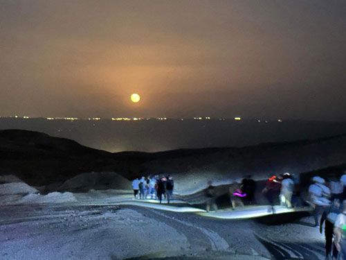 على وقع الخطوات بين الصخور الكلسية والسهول الجافة، انبهرَ المشاركون بجمال المشهد؛ القمر العملاق يشرق من الشرق، والبحر الميت يلمع من الغرب، في لوحة طبيعية فلكية نادرة.