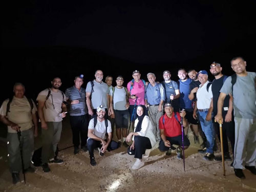 اعضاء الفريق خلال سيرهم في جبال اريحا لمشاهدة ظاهرة القمر الأزرق العملاق | صورة تجمع اعضاء فريق امشي وتعرف على بلدك خلال مسار ليلي |