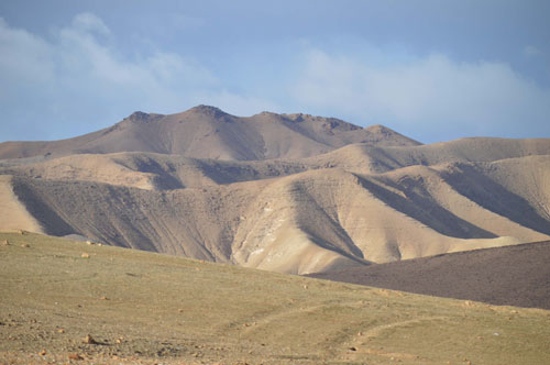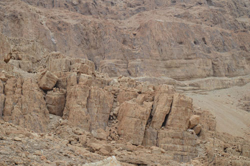 الجروف الصخرية والطبيعة الجبلية الصعبة في جبال اريحا والأغوار | البحر الميت كما يظهر من جبال اريحا في مسار القمر الدموي الليلي |