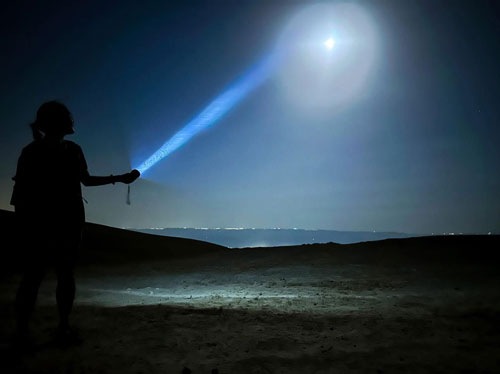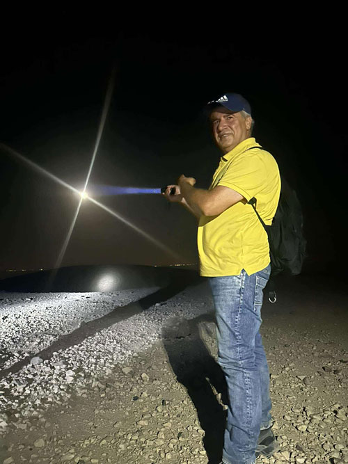 الباحث خالد أبو علي خلال المسار الليلي لمشاهدة ظاهرة القمر الأزرق العملاق | اطلالة على البحر الميت من جرف صخري حاد خلال احد المسارات الليلية |