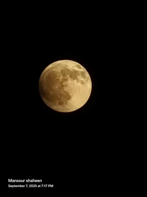 في ليلة، الأحد 7 أيلول 2025، كان العالم يترقب خسوفًا كليًا للقمر، أما هنا، في سماء فلسطين، فالمشهد أخذ بعدًا آخر، إذ شاهد الفريق صعود القمر من الشرق عند غروب الشمس (18:52)، ليبدأ الخسوف الجزئي الساعة (19:27)، ثم دخل في قلب ظل الأرض في تمام الساعة (20:30)، وتحول إلى قرص نحاسي أحمر، كأنه جرح سماوي يعكس وجع الأرض وأسطورتها، وعند الساعة (21:31) بلغ الخسوف ذروته، ثم انسحب شيئًا فشيئًا حتى استعاد القمر بياضه الكامل عند (22:56)