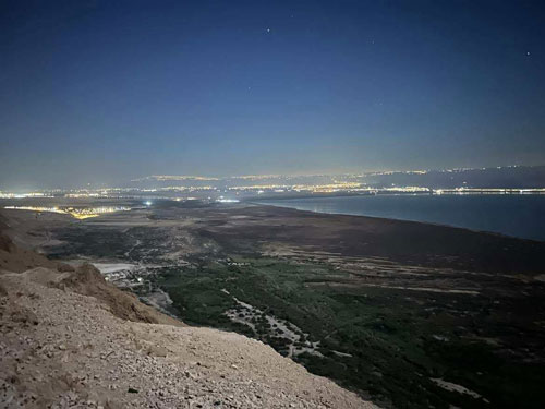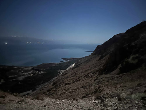 من أعالي جبال أريحا، ظهر البحر الميت تحت ضوء القمر العملاق، عاكسًا أضواء الفنادق على الضفة الأردنية وبين جنبات جبال أريحا، أقدم مدن العالم (10,000 ق.م)، سارَ الفريق بين الصخور الكلسية والسهول الجافة التي لا يتجاوز مطرها 200 ملم سنويًا.