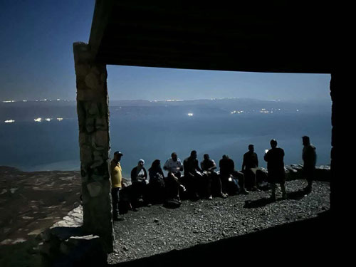الأغوار الأردنية كما تظهر في الجانب الآخر للبحر الميت خلال مسار القمر الدموي | اعضاء الفريق في استراحة على مطل عيون الفشخة لنهاية مسار ليلي بطول 25 كيلومتر |
