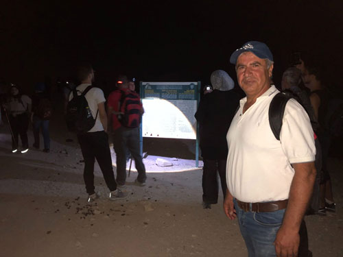 الباحث خالد ابو علي يشير الى القمر الأحمر الدموي خلال المسار الليلي | المشاء ماهر ثلجي احد المساعدين الأساسيين في الحفاظ على أمن وسلامة الفريق |